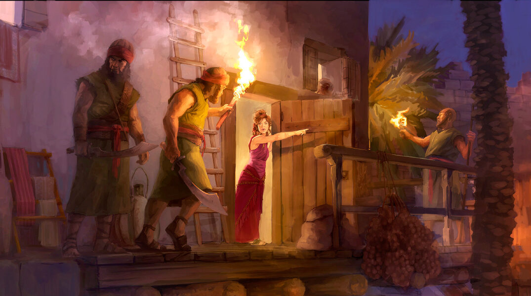 „2 S-a dat de ştire împăratului din Ierihon şi i-au spus: „Iată că nişte oameni dintre copiii lui Israel au venit aici astă noapte ca să iscodească ţara.” 3 Împăratul Ierihonului a trimis la Rahav să-i spună: „Scoate afară pe bărbaţii care au venit la tine şi care au intrat în casa ta, căci au venit să iscodească ţara.” 4 Femeia a luat pe cei doi bărbaţi şi i-a ascuns, şi a zis: „Este adevărat că bărbaţii aceştia au venit la mine, dar nu ştiam de unde sunt, 5 şi, fiindcă poarta a trebuit să se închidă noaptea, bărbaţii aceştia au ieşit afară; nu ştiu unde s-au dus: grăbiţi-vă de-i urmăriţi, şi-i veţi ajunge.” 6 Ea îi suise pe acoperiş şi-i ascunsese sub nişte mănunchiuri de in pe care-l întinsese pe acoperiş. 7 Oamenii aceia i-au urmărit pe drumul care duce la vadul Iordanului şi, după ce au ieşit ei, s-a închis poarta. 8 Înainte de a se culca iscoadele, Rahav s-a suit la ei pe acoperiş 9 şi le-a zis: „Ştiu că Domnul v-a dat ţara aceasta, căci ne-a apucat groaza de voi şi toţi locuitorii ţării tremură înaintea voastră. 10 Fiindcă am auzit cum, la ieşirea voastră din Egipt, Domnul a secat înaintea voastră apele Mării Roşii şi am auzit ce aţi făcut celor doi împăraţi ai amoriţilor dincolo de Iordan, lui Sihon şi Og, pe care i-aţi nimicit cu desăvârşire. 11 De când am auzit lucrul acesta, ni s-a tăiat inima şi toţi ne-am pierdut nădejdea înaintea voastră, căci Domnul, Dumnezeul vostru, este Dumnezeu sus în ceruri şi jos pe pământ”.